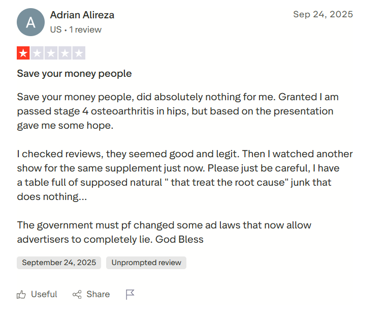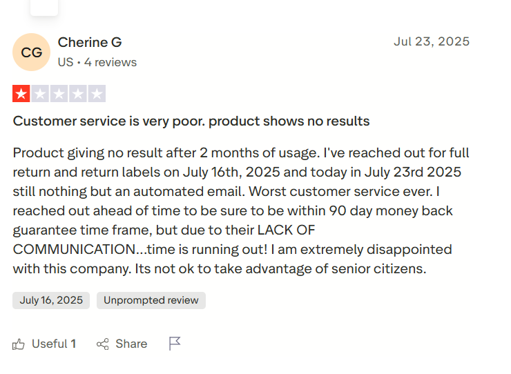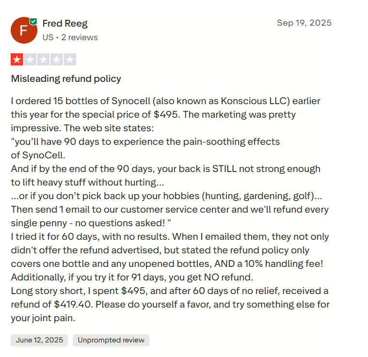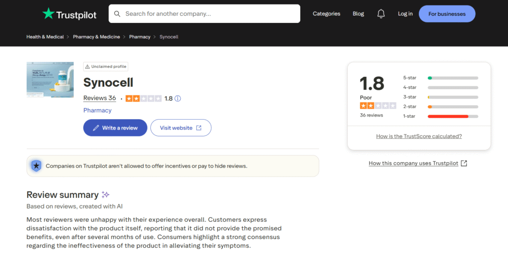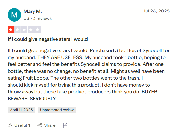 Verified buyer reviews on Trustpilot and other consumer sites frequently describe SynoCell as a waste of money. Common complaints include: